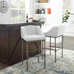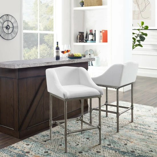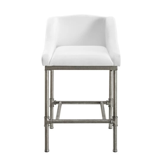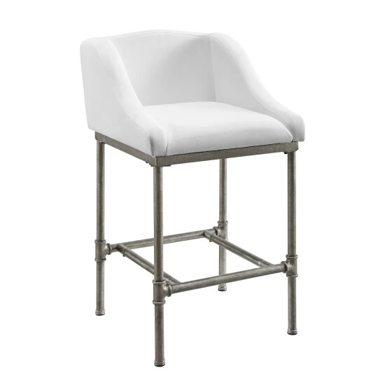 Afraid of bringing white into your design scheme when food or drink are close by? Be bold and brave with this stationary steel stool that perfectly marries the modern and industrial. Solidly constructed from a wide-set frame made from textured silver metal with pipe-jointed structure, the base of this stool effortlessly supports the low wingback chair fully wrapped in Β your choice of a matte black base with charcoal faux leather upholstery or a textured silver base with bright white performance fabric that is stain and wrinkle resistant, meaning you and your guests never have to worry about ruining your perfectly white bar stool. So, go ahead, break out that red wine. Youβve earned it. Available in Bar Height and Counter Height. Assembly required.