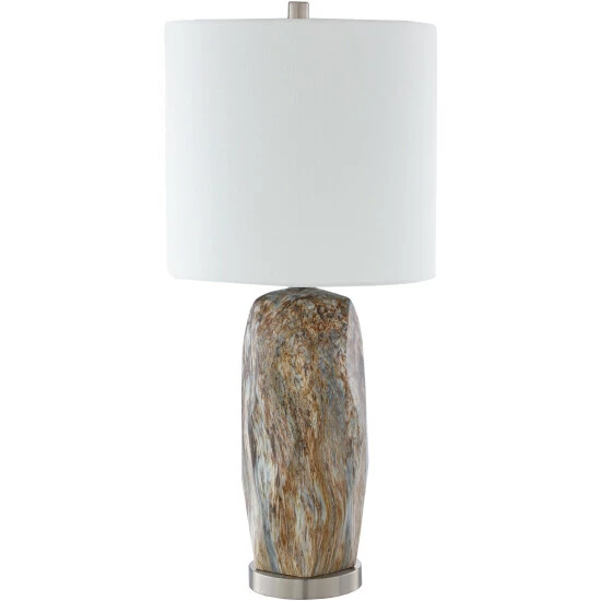 Bring an earthy look to your home with this Hutchinson table lamp from Carbon Loft. The lamp features a polished, contoured ceramic body with a brown marbled pattern, set over a polished metal base. A white linen drum shade diffuses the light, and completes the mod charm of this beautiful lamp.
