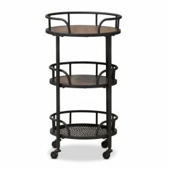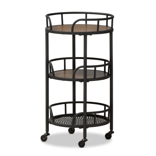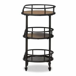 Use this Inyo mobile bar cart as a storage piece in the corner of your kitchen, then wheel it out on its castors when you have a party or gathering. The three antique-finish black metal shelves are perfecting for holding fine liquors, charcuterie, or other delicacies to serve to your guests.