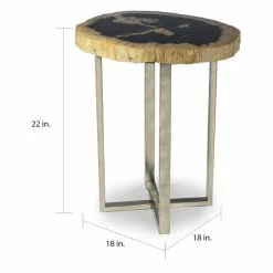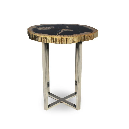 A one of a kind piece, the Eliza End Table offers the perfect balance of organic elements with sleek modern design. These unique tops are constructed from petrified wood slices that have been sanded and polished, accentuating their natural color variations and distinct patterns. It sits atop a clean geometric stainless steel base.