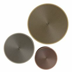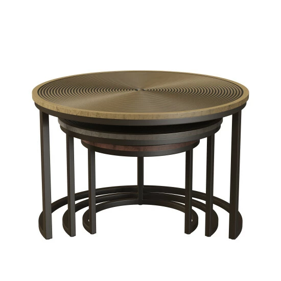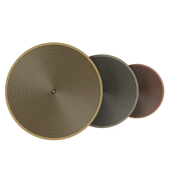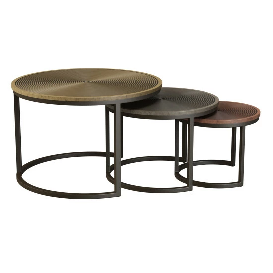Hand crafted of metal and hand finished in copper, brass and nickel, this set of three nesting cocktail tables features concentric grooves that convey a sense of motion. The crescent-shaped bases with an oiled-bronze finish allow tables to nest neatly when not in use. Varying heights and finishes make for an eclectic display when grouped together.