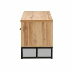Sleek lines and natural wood tones are perfectly paired with metal legs for a clean industrial look in this TV stand. An abundance of storage solutions offer cord management cutouts for a neat and tidy entertainment center you will be proud to show off in your space.