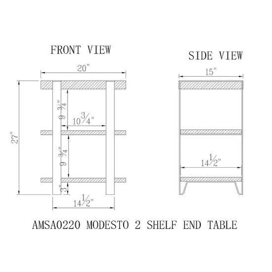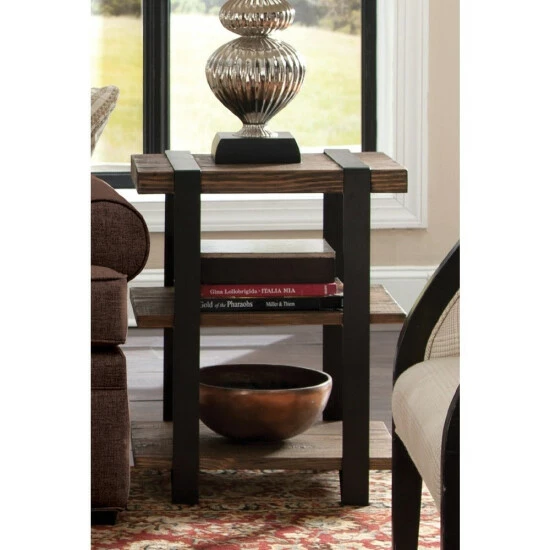 Featuring exquisite workmanship of solid wood tops with wrapped metal strap and metal legs, the Modesto collection furniture will last for years to come. The reclaimed wood finish highlights the cracks, knots, and wood grain that is unique to each piece. Modesto 2-Shelf End Table with reclaimed wood and wrapped metal strap will add warmth to any dΓΒ©cor. The rustic, natural finish and design provide an industrial element to your room. Add your favorite lamp, books, magazines, or knick knack to complete your decorating style.