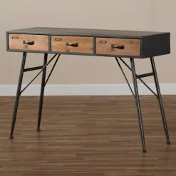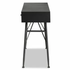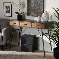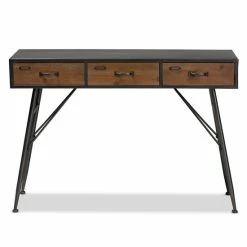 Introduce crisp, distinctive industrial flair to your entryway with this chic and lovely console table. Designed for convenience, this piece contains three drawers which give plenty of space for keys, mail, or supplies. This piece requires assembly and is supported by thin, angled legs that fit well in tight spaces and allow for additional storage space underneath.
