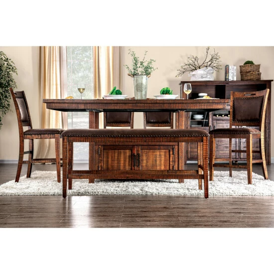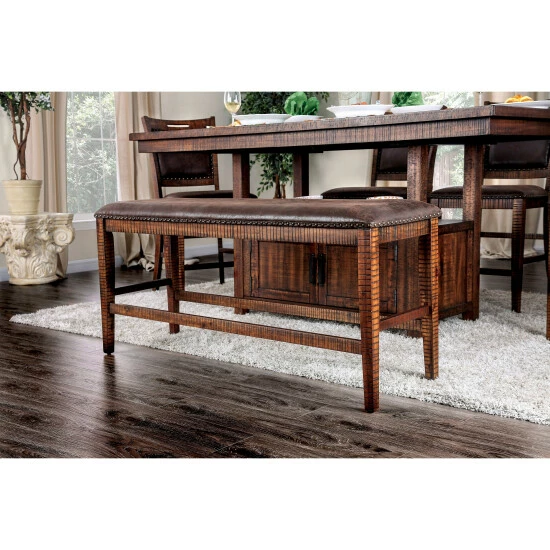 Lend some eye-catching panache and rustic flair to your dining space with this bold and alluring counter bench. A light walnut finish is highlighted with texture and paired with leatherette and a nailhead trim for a traditional touch sure to enrich your decor in an instant.