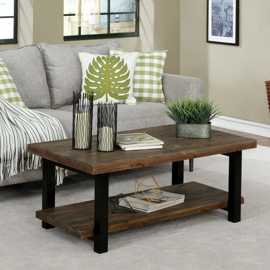 This coffee table is sure to make a splash in your living space. Farmhouse flair meets industrial ingenuity in the mix of materials and blend of new and reclaimed solid wood. A rugged design bears a great deal of weight for decor items and coffee cups, making your living room one of wonderful variety.