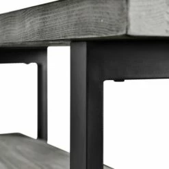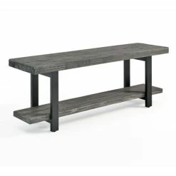 This wooden bench is constructed of solid pine wood and finished to have the appearance of reclaimed wood. The reclaimed wood finish highlights natural wood variations such as cracks and knots which add to the piece’s character. Β It will add to the rustic industrial style of any space.