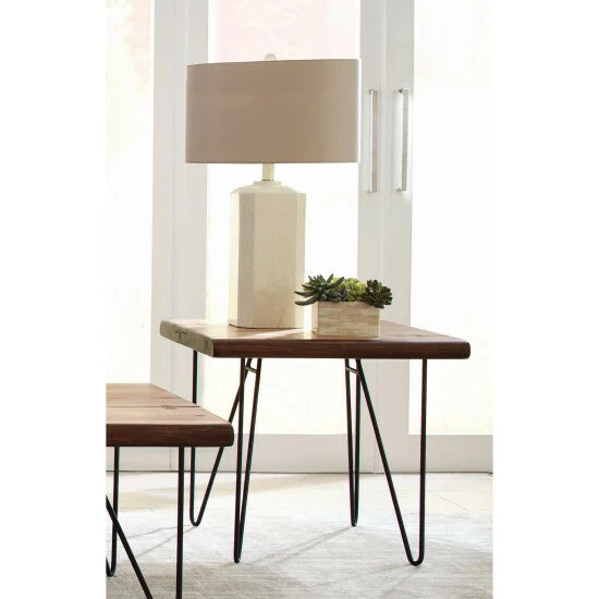 Infuse some striking mid-century modern flair into your home with this chic and expressive end table. Open hairpin legs deliver an airy feel that is paired perfectly with the robust lines of the top, offering a sturdy structure bound to bear up your favorite decor items.