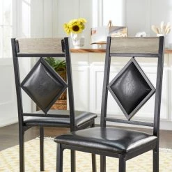 Perfect for compact spaces or hang out areas of the home, this black finish 5-piece dinette set brings function and unique style to any room. A sleek, black powder coated metal frame contrasts with a light, MDF table top and chair accents to display a subtle, industrial vibe. These chairs offer up an inviting and comfortable spot for family and friends to sit with their black, faux leather seat cushions and matching diamond shaped chair backs. Place this set in an intimate nook of your home for sophisticated and charming fashion that’s sure to leave a lasting impression.