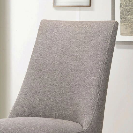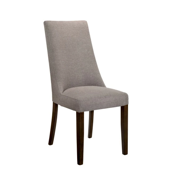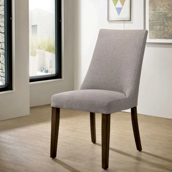 These fabric upholstered dining chairs keep their look simple so the true beauty of their design can show through. Its deep warm wood finish on the legs highlights the light colored fabric upholstered seat. A slight curve around the back to the sides gives you a comfortable backrest to lean against.