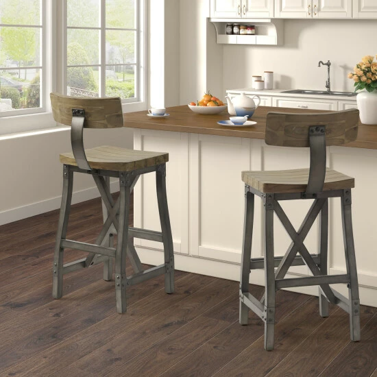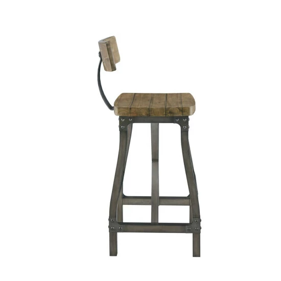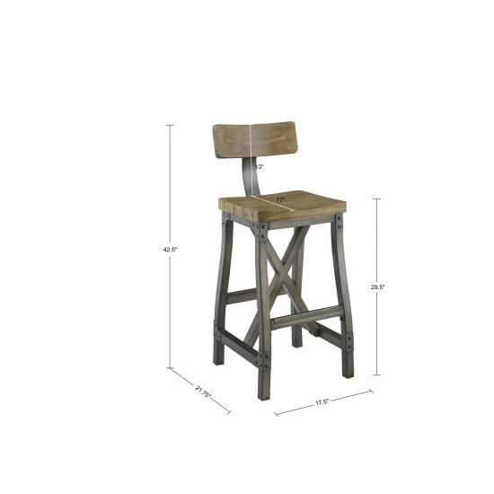 This charming bar stool recalls another era with bases inspired by cast iron machinery and heavy timber flooring. The wood legs have a gunmetal finish, enhancing the stool’s industrial look. Additionally, this bar stool can be used with or without the back.