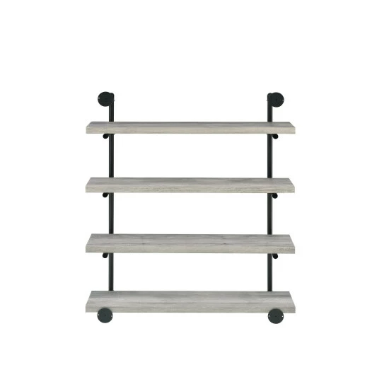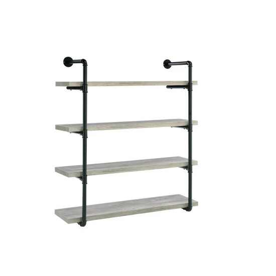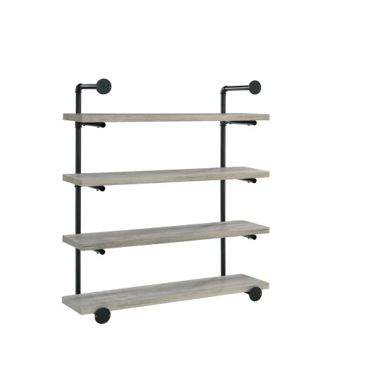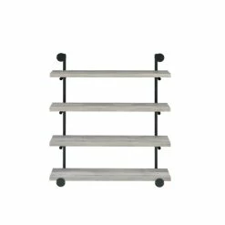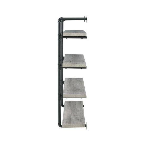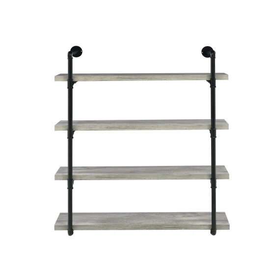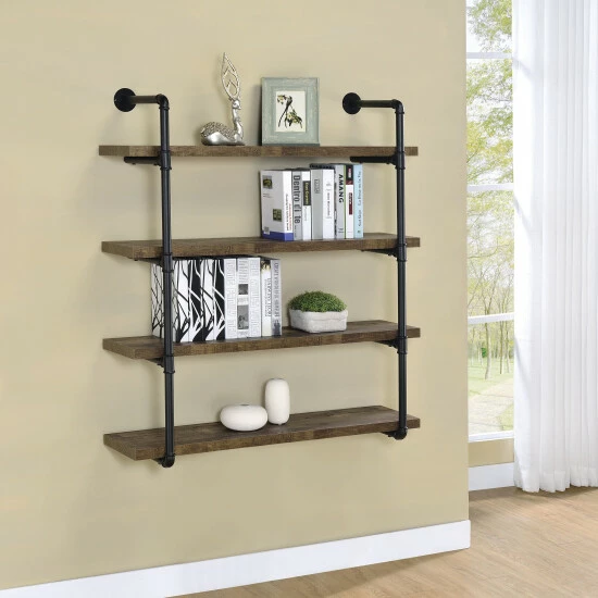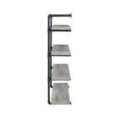 Industrial design can be elegant, as shown by this wall shelf. Plumbing pipe frame highlights the rugged utility that’s the hallmark of the style. Wall hanging adds a unique element to the piece. Incorporates four (4) open shelves for ease of storage or display. Available in a variety of finishes and widths for your specific style and space needs.