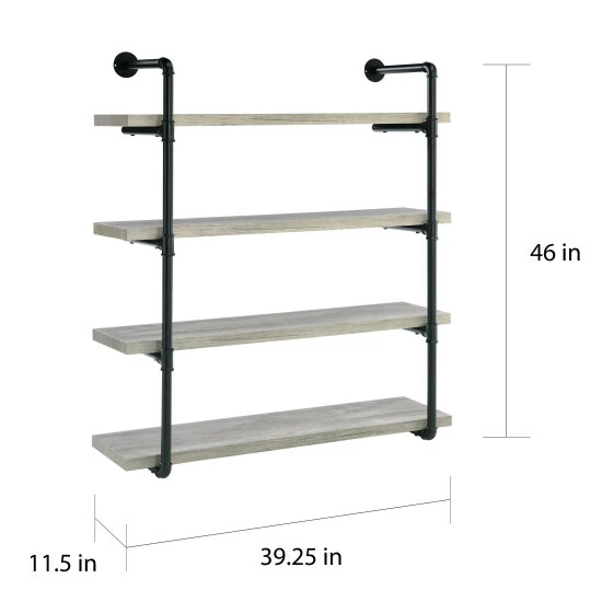 - Wall shelf dimensions: 46 inches high x 39.25 inches wide x 11.5 inches deep