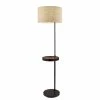 An essential addition to your work space, this task shelf floor lamp includes a wireless charging pad with inductive charging technology. A matte black finish is mixed with walnut wood for mid-century modern appeal. Adjust the shade to direct the light where it is needed. A round shelf holds the wireless charging pad and can also be used for extra storage needs.