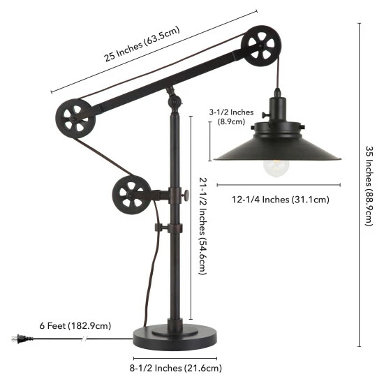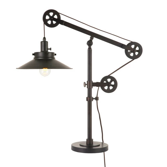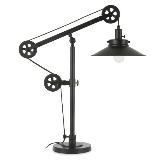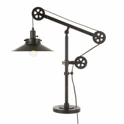 This unique and eye-catching industrial table lamp is made to be the center of attention on your bedroom nightstand, bedroom, living room, dining, or even your study and office. It’s a conversational modern twist on a traditional and classic design. Hand crafted from metal in a deep contemporary blackened bronze, brass, or steel finish and featuring a functional adjustable pulley system, this will be the centerpiece of any room.