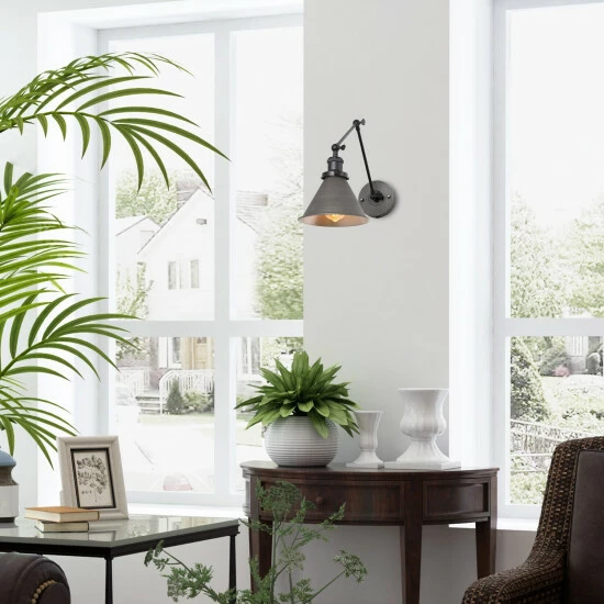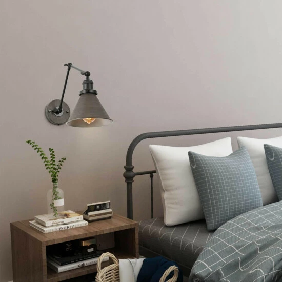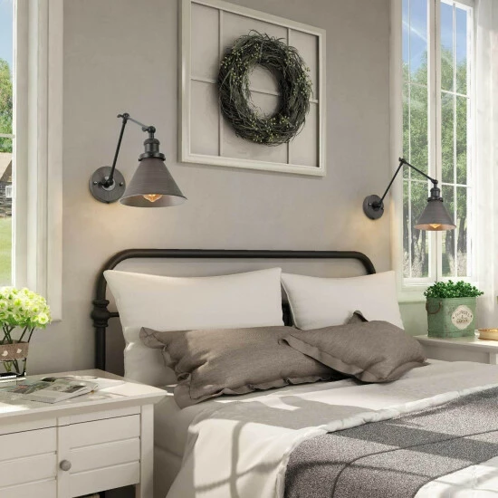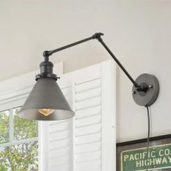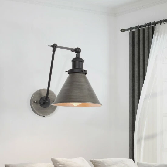 - It features an classic black finish with a bell shade. Functional swing arm extension allows you to direct the light up and down.