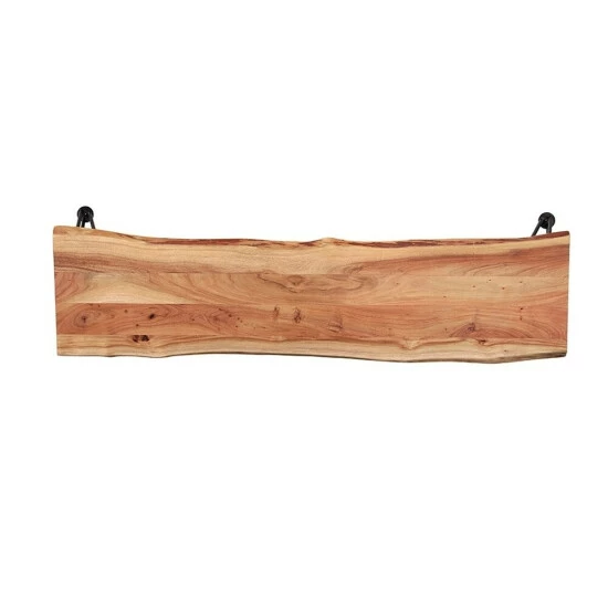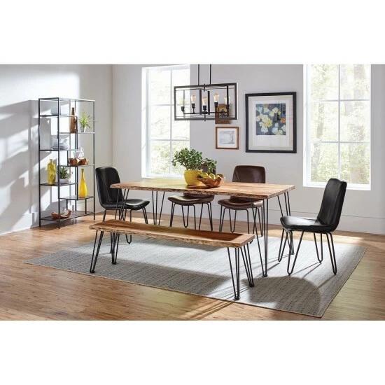 The perfect marriage of rustic charm and industrial design, this rectangular dining bench makes a modern statement. Designed with natural acacia, the bench top features an exposed wood grain with slight distressing. Contrasting against this warmth is the dark tone from the gunmetal finish of the legs. Four open hairpins, created with thin metal, support the rustic top. Add coziness to a sleek and contemporary motif with the charming hues and materials.