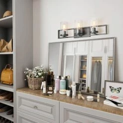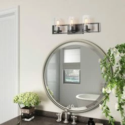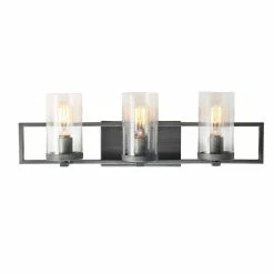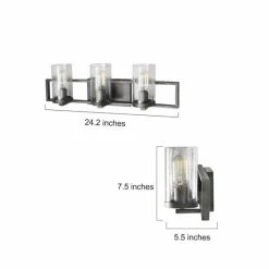 - Designed to live in damp areas, like bathrooms with steamy showers, this three-light industrial-inspired vanity fixture has the perfect size to fit and shine over your sinks.Β