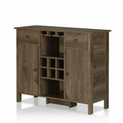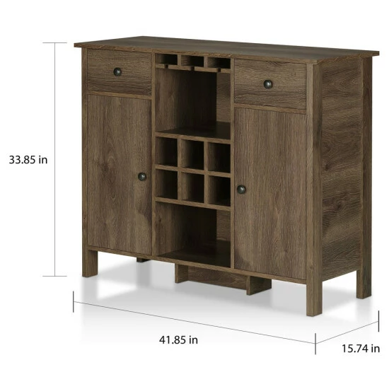 Keep your wine bottles, glasses, and other supplies neatly organized with this lovely wine cabinet. This wood cabinet features a charming distressed walnut finish for a contemporary farmhouse look. Six wine bottle shelves, three stemware racks, two drawers, and two cabinets provide all the storage space you need.