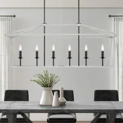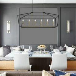 Sure to shine, this eye-catching pendant is crafted from metal, The bold frame of this pendant creates an alluring fixture above your dining room table. Its openness allows for a big look without coming across as overly bulky. Six-toned lights with flame-shaped bulbs give the illusion of real candles without the fuss of dripping wax or flickering flames. showcasing an openwork silhouette that adds a dash of architectural appeal to your space. Inside, six candle-style sockets hold aloft 60 W maximum bulbs (not included). This hardwired design is also compatible with a dimmer switch, so you can set the mood as you please.