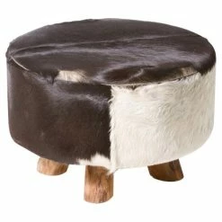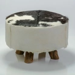 This round ottoman is a decorative and functional accent to your home. Upholstered in a genuine goat hide leather in natural shades of black and white. Featuring a solid wood frame and natural reclaimed wood legs. As each hide is inherently unique please note that color proportions and hair length/direction will vary.