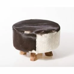 This round ottoman is a decorative and functional accent to your home. Upholstered in a genuine goat hide leather in natural shades of black and white. Featuring a solid wood frame and natural reclaimed wood legs. As each hide is inherently unique please note that color proportions and hair length/direction will vary.