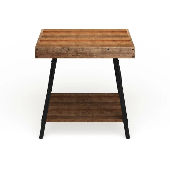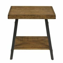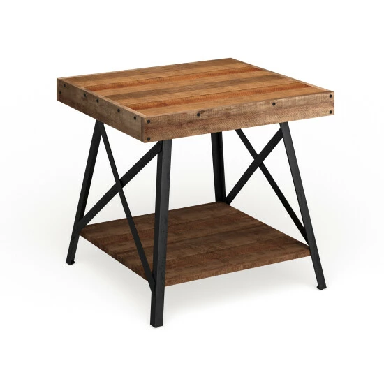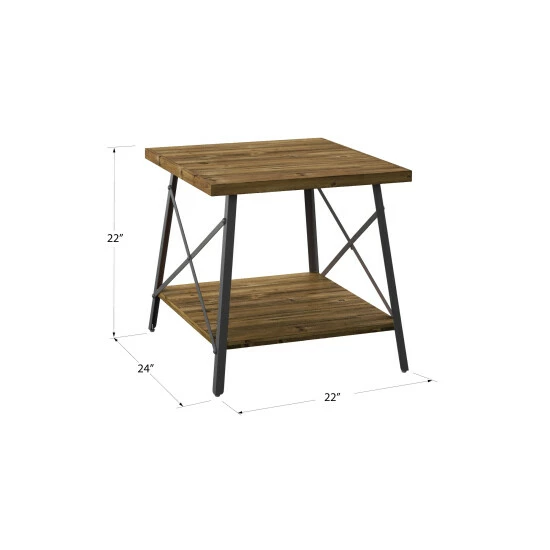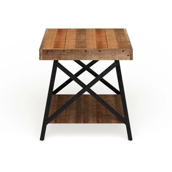 Made of reclaimed wood and metal, this end table brings the right coastal farmhouse look to your living room or bedroom. Its robust frame, made of solid pine and accented with wood scoring for vintage appeal, boasts exposed screws and x-shaped metal legs, as a handy bottom shelf offers additional space for storage or display.