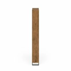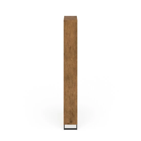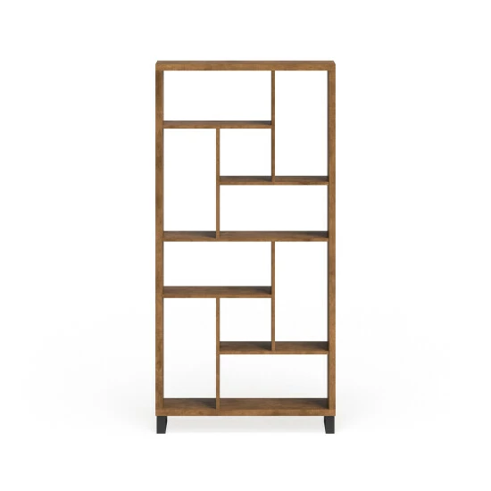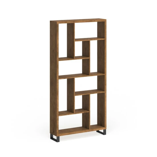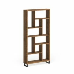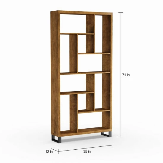 Make a statement anywhere in your home with this rustic antique-finished nutmeg bookcase. Crafted from tough, ecofriendly particle board and melamine on metal sleigh legs, this tall bookcase features 10 compartments in different shapes and sizes just right for displaying your favorite books, statuary, and memorabilia.