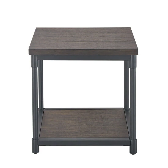 Bring form and function to your home with this rustic end table finished in smokey Oak with a sturdy antique black iron frame. A spacious bottom shelf is perfect for storage or display. Floor glides help protect your floors from scratches.