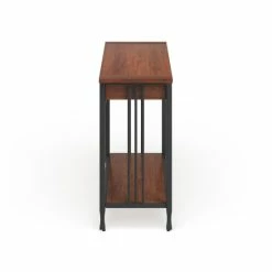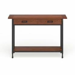 Decorate your home with this mission oak sofa table. This table is constructed of hardwood solids and oak veneers. Traditional mission slats echoed in a contemporary, two-piece custom drawer pull will add style and appeal. Constructed with two drawers and one shelf, this table provides plenty of storage space as well. The compact construction is perfect for any small space in your home.