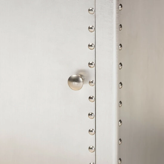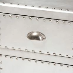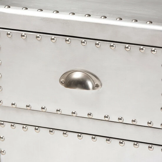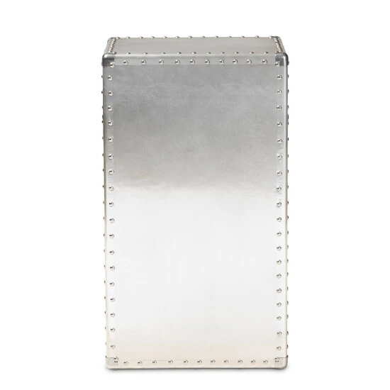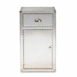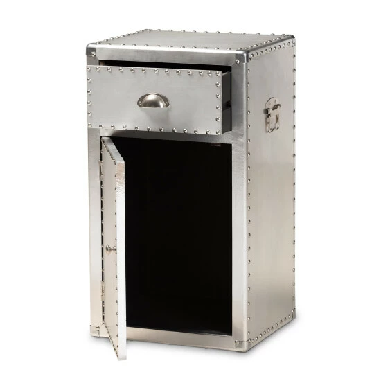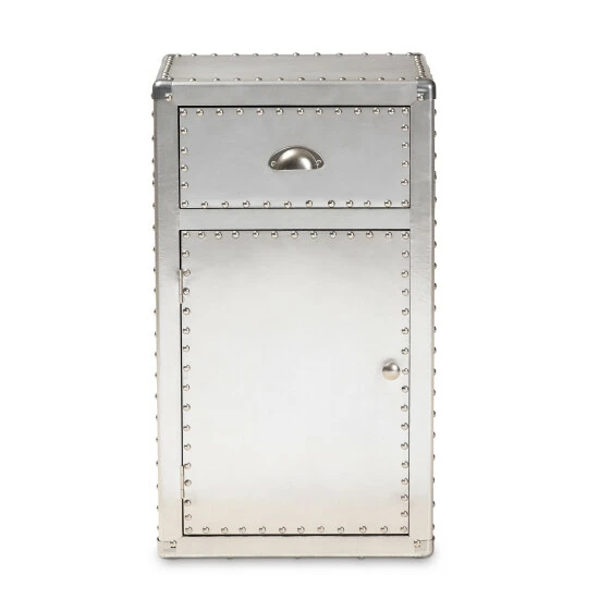 Organize your items with this Serge silver metal one-door storage cabinet. Featuring one drawer and a compartment with a door beneath, this cabinet lets you keep your personal items concealed while bringing a French industrial vibe into your space. Aluminum construction and polished metal hardware add a sophisticated touch.