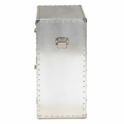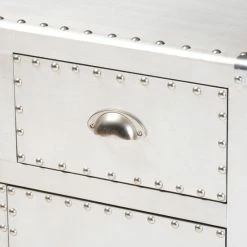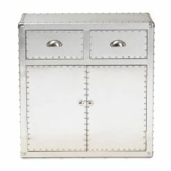 Rev up your industrial scheme with this silvertone accent cabinet. This storage cabinet features a neutral finish, polished silver handles, and rivet embellishments for an attention-drawing result. Featuring two drawers and one hidden compartment, this two-door cabinet eases your home organization process.