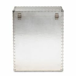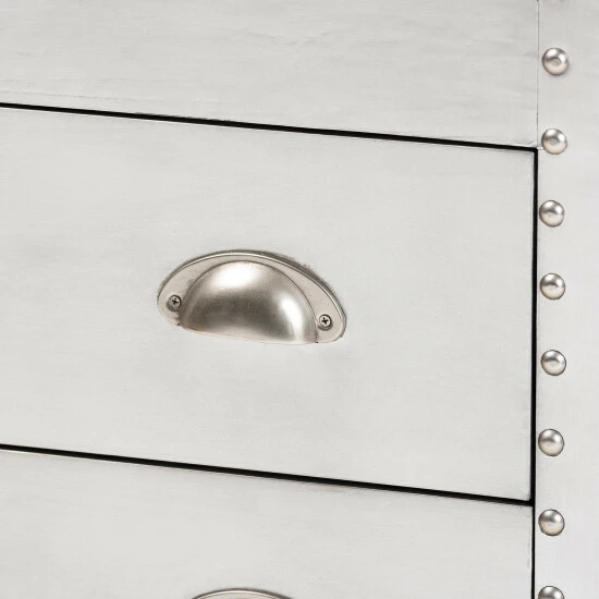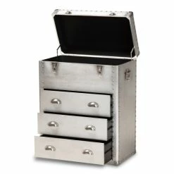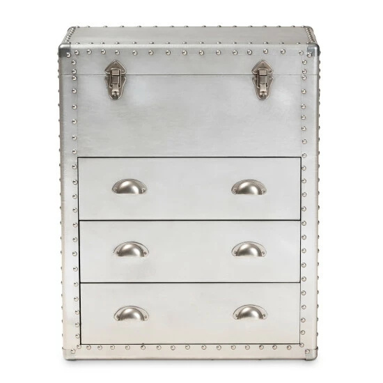 Accent your space with this storage storage cabinet from Baxter Studio. The Serge storage cabinet features an edgy metal design with silver finish that lends an industrial appeal to your bedroom or office. Three drawers keep small items safe and organized, and the unique lift-top compartment provides additional storage space for convenience. This piece arrives assembled for instant setup.
