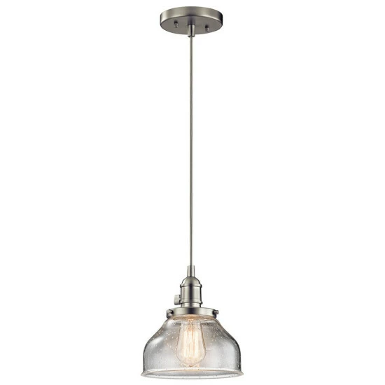 Invite industrial-inspired elegance into your home with this single-light mini pendant. This striking brushed nickel fixture showcases a nickel-finished cord leading down to a clear seedy glass shade with a slight curve to it.