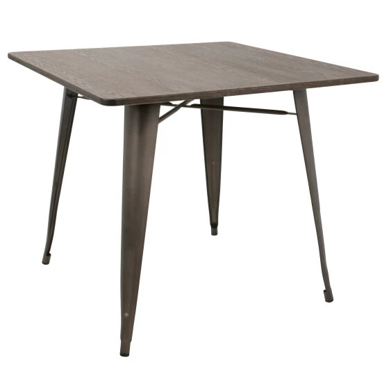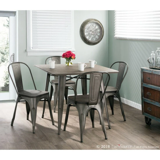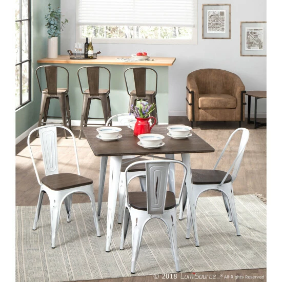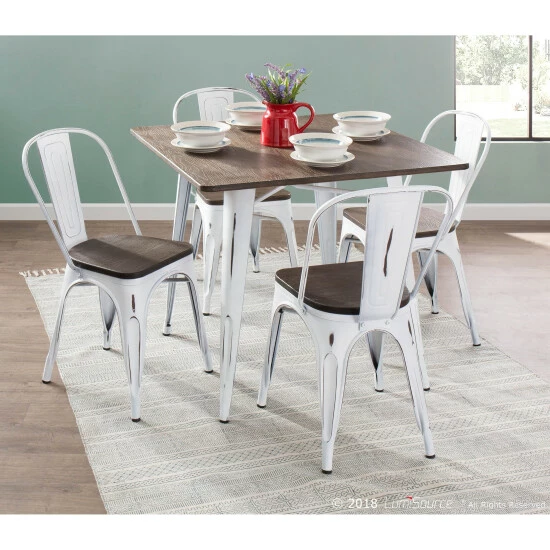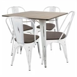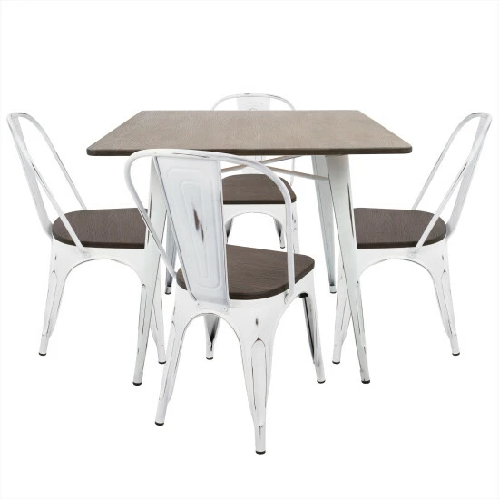 Antiqued metal legs are juxtaposed with a wooden tabletop and seats to create the epitome of cool in this industrial-inspired dining solution. Includes one table and four chairs.