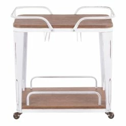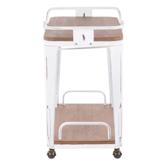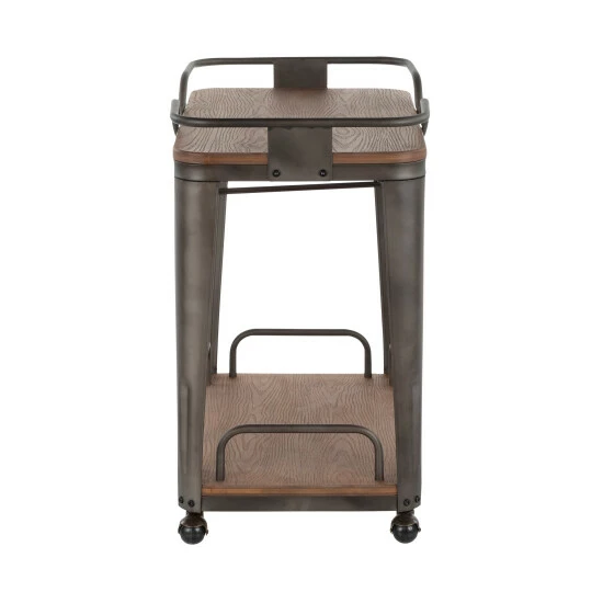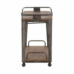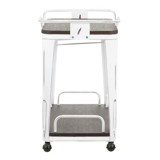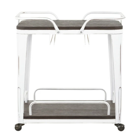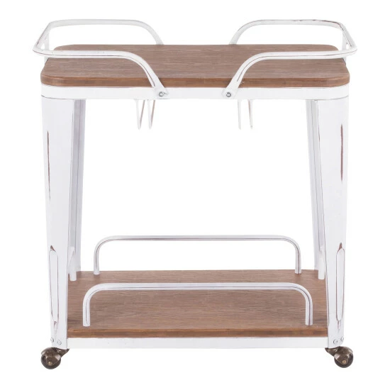Serve your guests their favorite drinks from the convenience of this bar cart. This wheeled cart moves where you need it for versatile use, and hanging stemware rails and storage shelves let you keep everything you need close and handy. Metal and wood with distressed finishing combine into a beautiful industrial design that will look great at your next party.