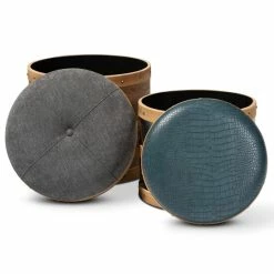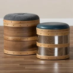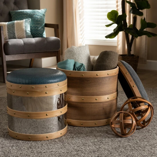 Deliver vibrant personality and coastal warmth to your home with this set of unique and charming ottomans. Each piece brings forth a distinct look, as the larger ottoman features an oak finished wood exterior topped with a grey fabric that brilliantly contrasts with the smaller ottoman’s mirrored surface and blue alligator scaled faux leather. Oak finished wood bands lined with gold-tone studs to add rustic charm.