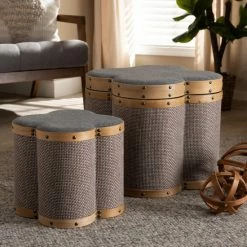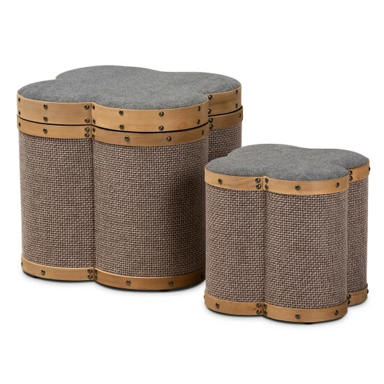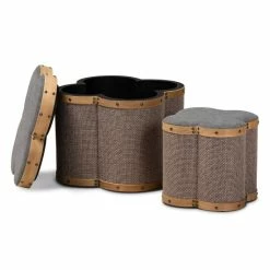 Fabulous, alluring, and artful, these ottomans are sure to lend a lively splash to home decor. The exterior of the pieces are covered in a knitted fabric for a soft, warm, and welcoming touch. Oak brown finished wood bands accented with metal studs line the edges of the ottomans to add rustic charm.