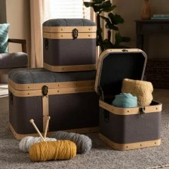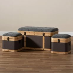 Have some fun with storage and organization with these delightful and distinctive trunks. Old-world artfulness meets industrial ingenuity in the stylish and lasting design. Oak brown finished bands lined with gold-tone metal studs decorate each trunk and complement the grey fabric upholstery.