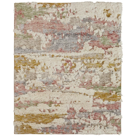 - Features a modern abstract pattern with tones of pink, gold, green, light blue and ivory