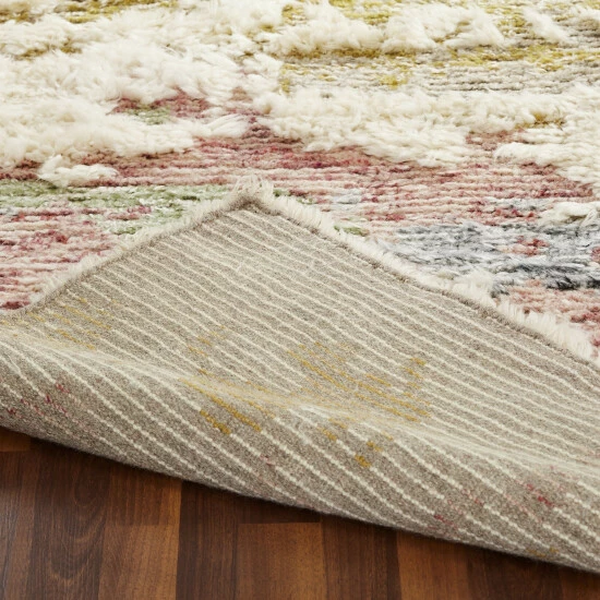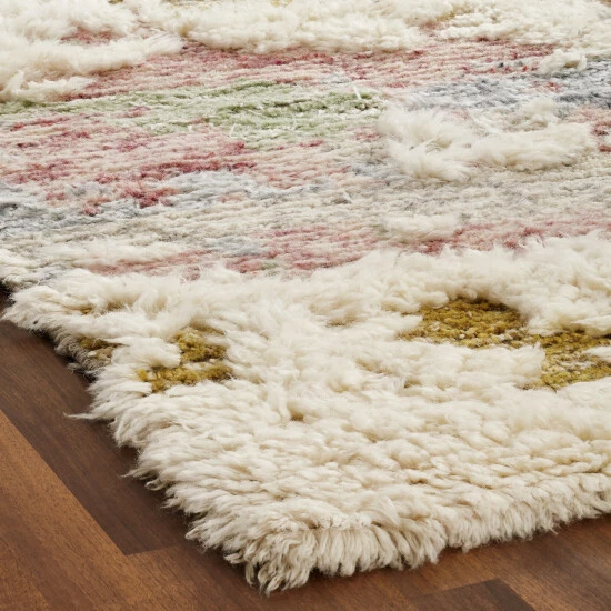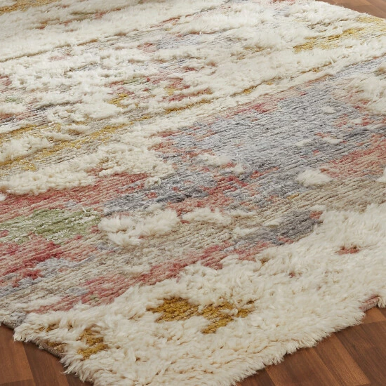 Handknotted of 100-percent wool in a thick shag-type of high-low pile, this exuberant collection of delightfully casual modern abstract designs in fun fashion colors is the ideal complement to a variety of today’s popular modern furniture styles. Easy to clean and maintain, this rug does not feature a latex backing.