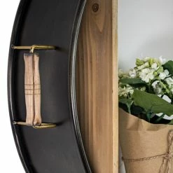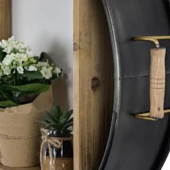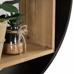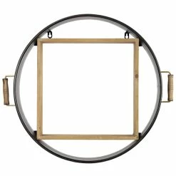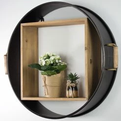 Embellish your home with the striking impact and alluring geometry of this hanging wall shelf. The round iron frame houses a natural wood shelf for an artful touch perfect for displaying treasured photos or other decor items. Two keyhole slots on the back and handles on the side ensure that this shelf is easy to hang in any area in your home.