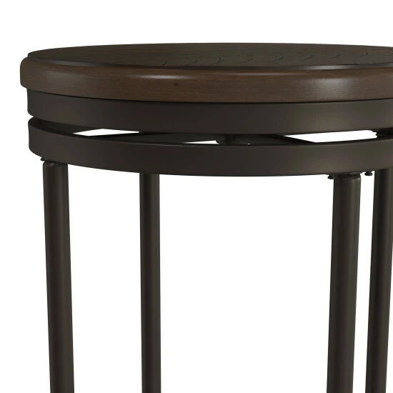 - The 360 degree round swivel wood seat features a distressed walnut finish with wood plank style and contrasting grain patterns