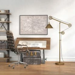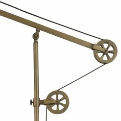 Forged in metal, this floor lamp counterbalances function and design. It features an adjustable pulley system allowing you to personalize your space.β’ Forged in antique brass, this lamp adds an industrial chic element to any space.β’ The bell shape of this antique brass shade casts light in the direction of interest.β’ The shade is metal finished in antique brass. β’ Rated for one 100W incandescent bulb; 9W LED bulb, 23W fluorescent (CFL) bulb, or 9W self-ballasted LED bulb. E26-base bulb.β’ Includes an 8 ft. cord.β’ Clean with a soft, dry cloth; no harsh chemicals or abrasive cleaning materials.
