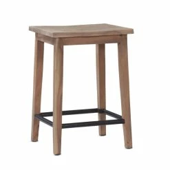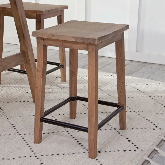 The versatile design of this sawhorse inspired counter height stool make it a stylish addition to your dining table, kitchen island or bar. Crafted from solid Acacia wood in a natural finish and featuring durable powder coated antique gray iron stretchers. The shaped seat is both comfortable and stylish and the stretchers work as cozy footrests. Levelers on the bottom of each leg help protect the floor from scratches and keep the seat level in case of uneven floors.