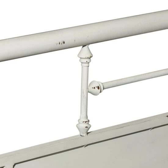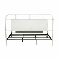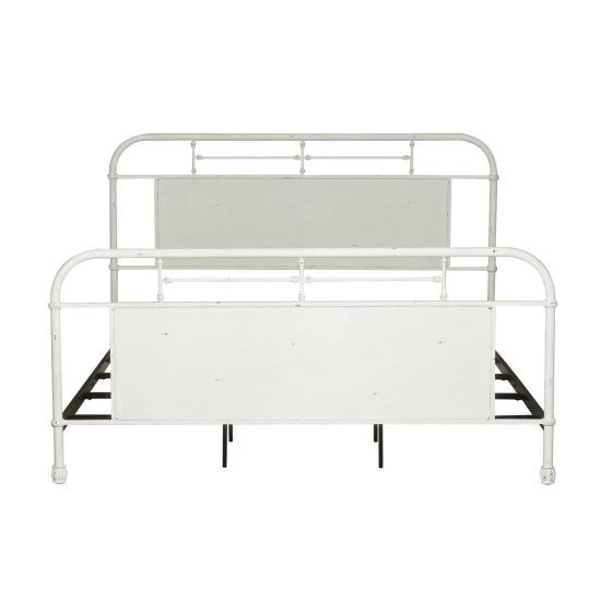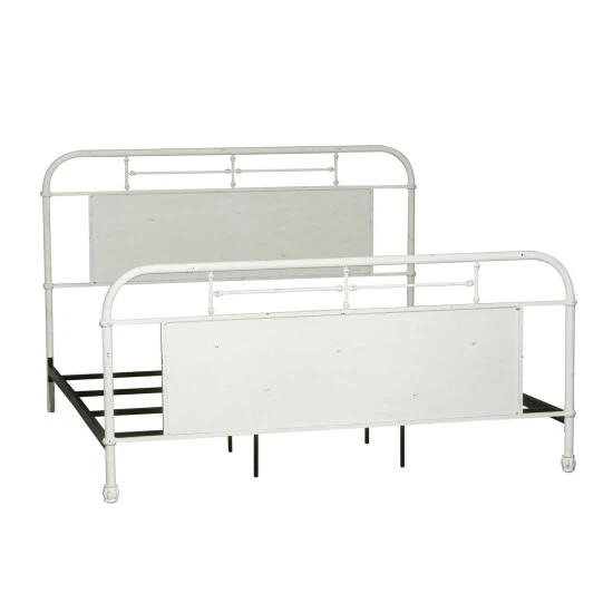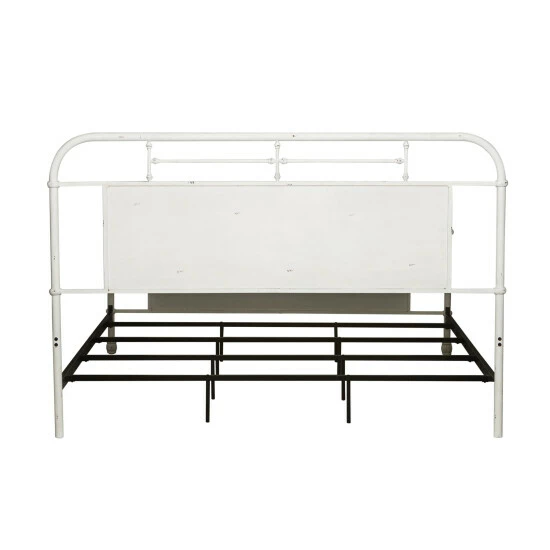 Add a unique look to your home with the Vintage Series Queen Metal Bed. Crafted of metal tube and finished in a beautiful antique white with wear thru. The headboard and footboard feature a softly shaped cap rail and turned metal spindles highlighting a center panel. The metal side rails and bed slats are finished in the antique white with wear thru. The Vintage Series headboard will work with a metal bed frame making it perfect in small spaces and any decor from cottage to farmhouse.