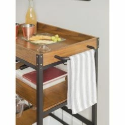 Create your signature cocktail or pour your favorite vintage for guests from the Carbon Loft Wheeler Kitchen/Wine Cart. An embodiment of rustic style, this cart is made with a smooth wooden top and two lower wooden shelves. An industrial-esque metal frame with built-in wine bottle holders, glass storage, and more. Keep your items stored securely and stylishly.