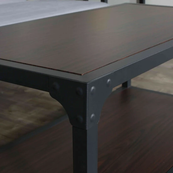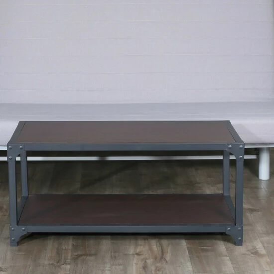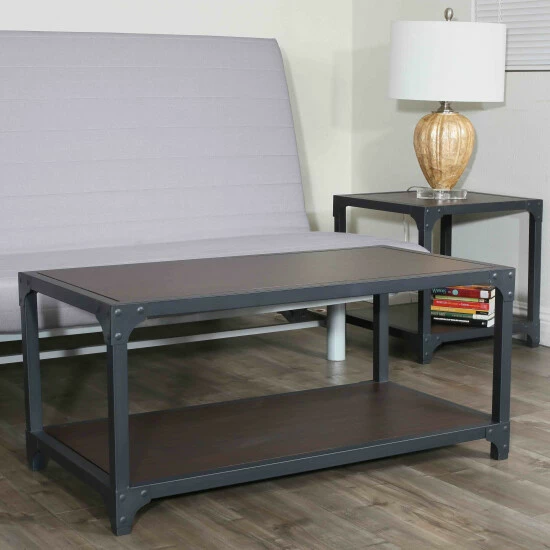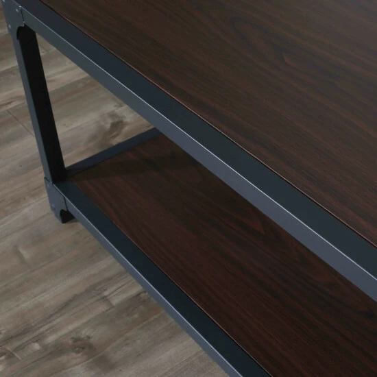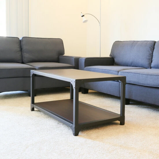 Sleek, modern, and crisp, this coffee table is the perfect addition to contemporary industrial decor. The bold metal frame is finished in black to juxtapose with the walnut finish on the tabletop for a touch of dimension and flair.