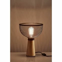 Convert your safe haven to a deliciously lighted sanctuary, with this distinctively styled table lamp. A contemporary black metal mesh shade is paired with a natural rubber wood cylinder base resulting in a modern industrial style with hints of Scandinavian influence. This style looks great with all bulb types. Use a vintage Edison bulb for soft, mood lighting or an LED bulb for efficient ambient light.