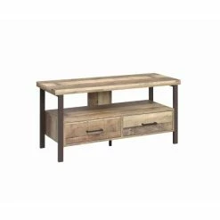 This handsome wood TV console looks great in an entertainment room or home bar. Right at four feet wide, it’s perfectly sized for up to 50-inch TVs. The console also includes a roomy shelf under the TV top to display small decorative vases or candles. Below that are two roomy drawers to store an extra blanket or two. Console has black finished legs and a wood grain finish that’s charismatic and timeless.